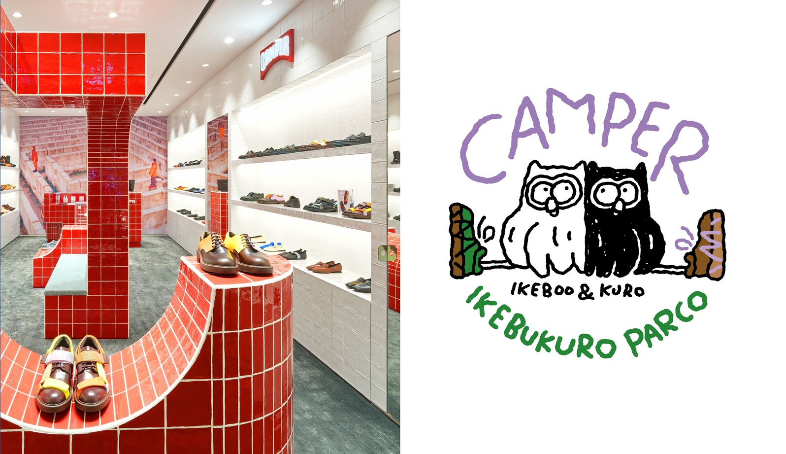 池袋PARCOの店装は、地中海を思わせる不規則なテクスチャーのタイルを使用し、ブランドを象徴する赤と白を基調にしたデザイン。カンペールの故郷であるスペイン・マヨルカ島へのオマージュをコンセプトに、リラックスした雰囲気のなかでショッピングを楽しめる空間に仕上げている。また、カーボンフットプリント削減のため、世界中で入手可能な素材を採用し、環境への配慮も重視した設計にしている。