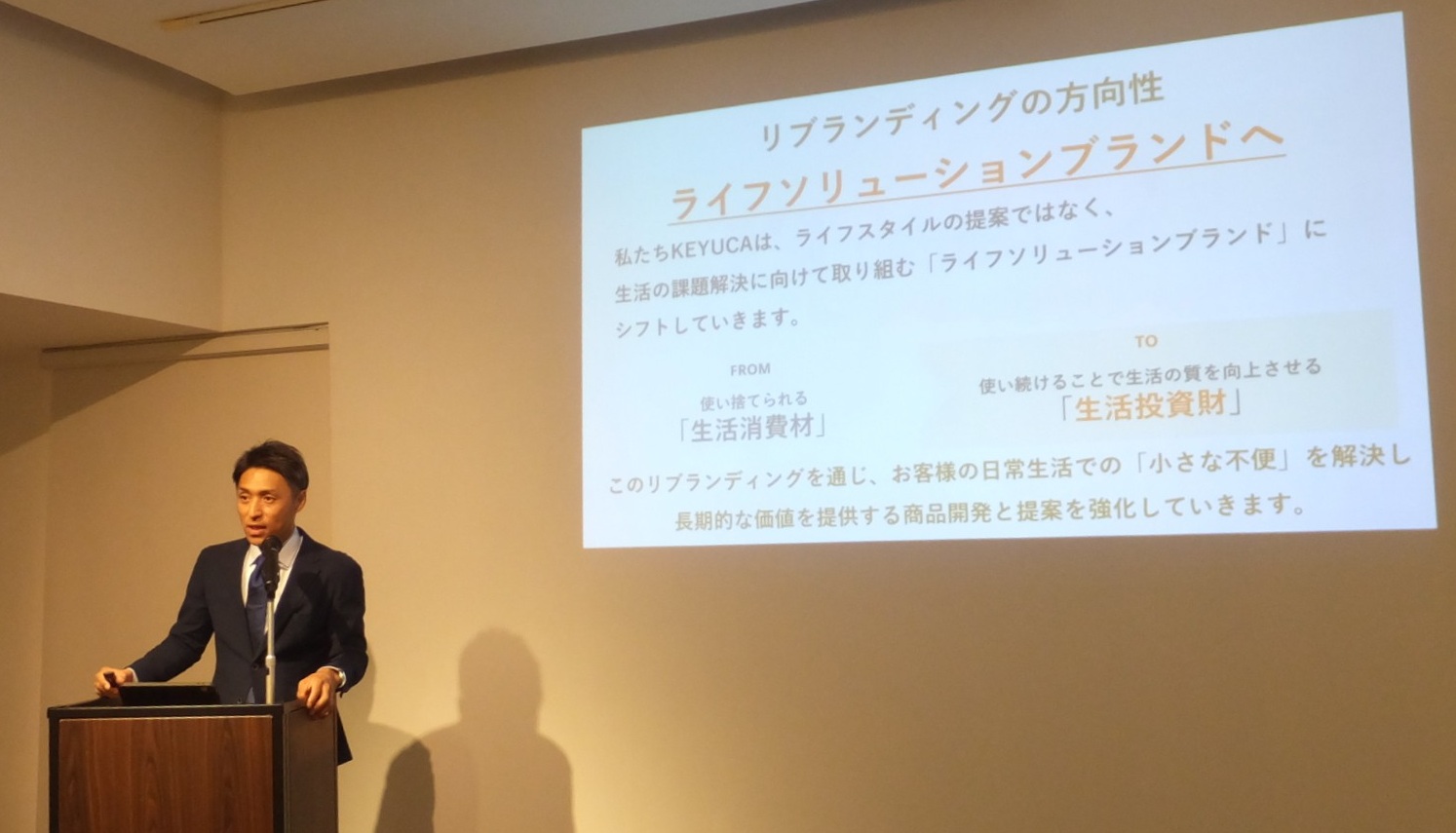 リブランディングについて説明するケユカ事業部の渡邉陽平事業部長