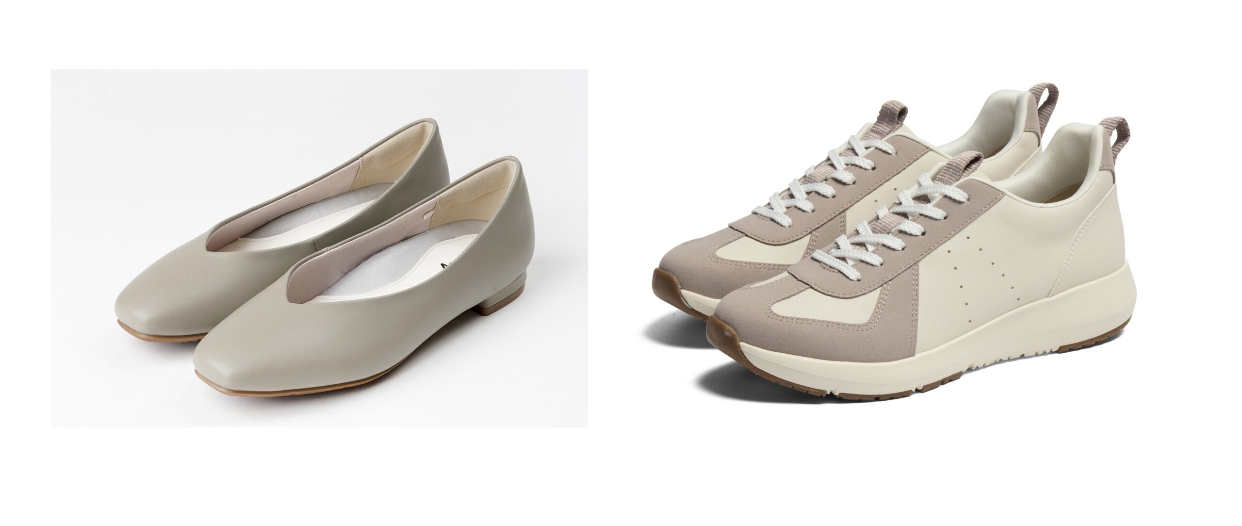 ‟母趾にやさしい”シリーズの㊧「母趾にやさしいVカットパンプス」と㊨「母趾にやさしいスニーカー」