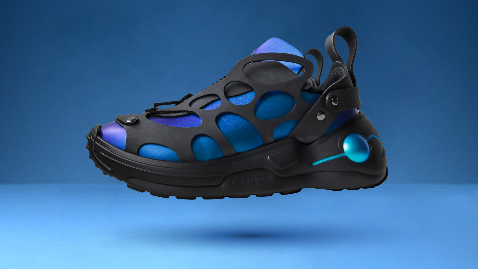 磁力で宙に浮かぶ靴は、子どもから大人まで誰もが抱く「空を飛びたい」という夢を表現した一足。電磁石の反発と吸引を応用した浮遊展示で、来場者に驚きと夢を届ける。アッパーには、光の角度で色彩が変化する未来を感じさせる素材を採用している。