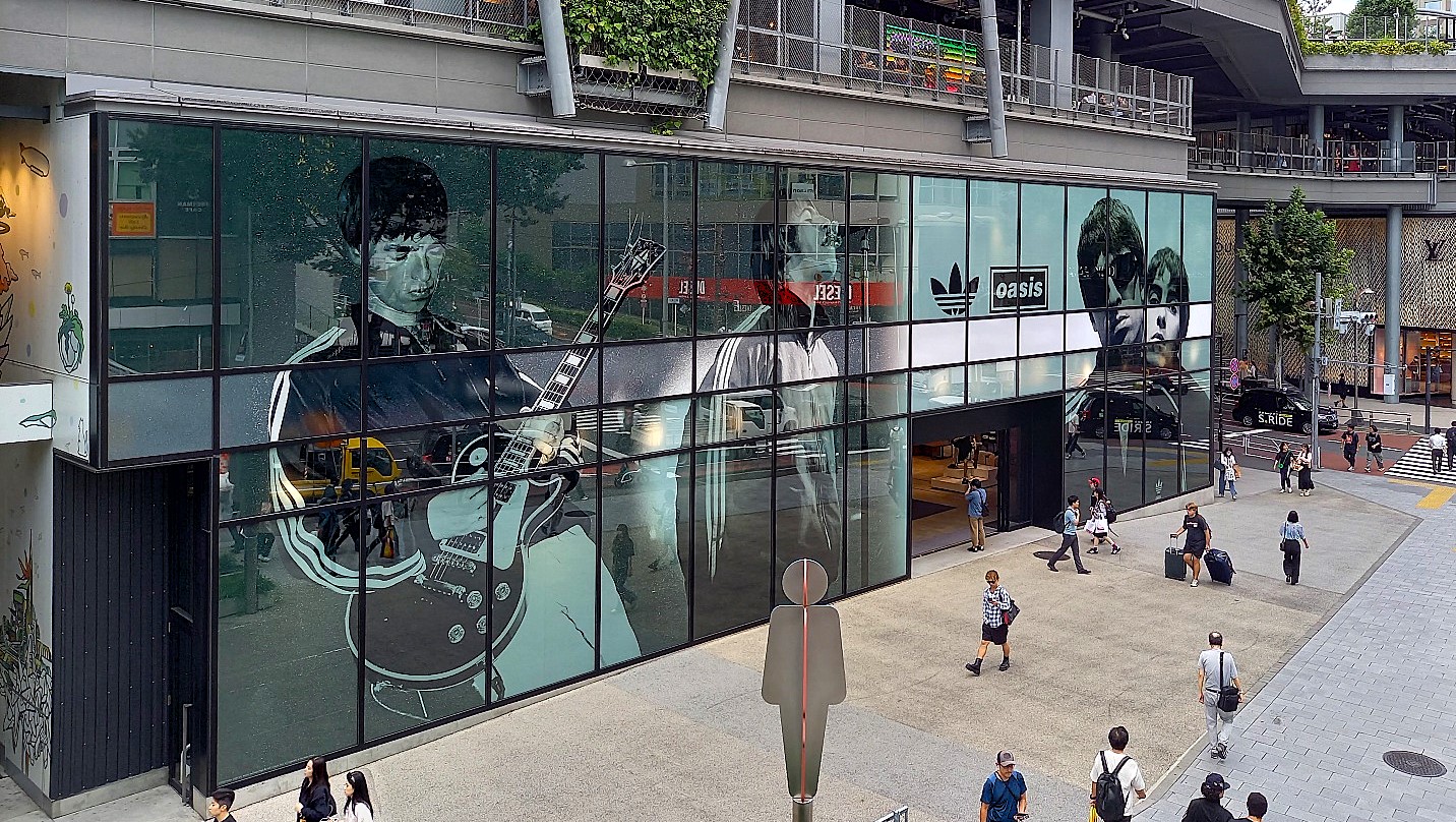 Oasisの90年代のビジュアルで埋め尽くされた「アディダス ブランドセンター RAYARD MIYASHITA PARK」の外壁。初日24日の開店前には長蛇の列ができた