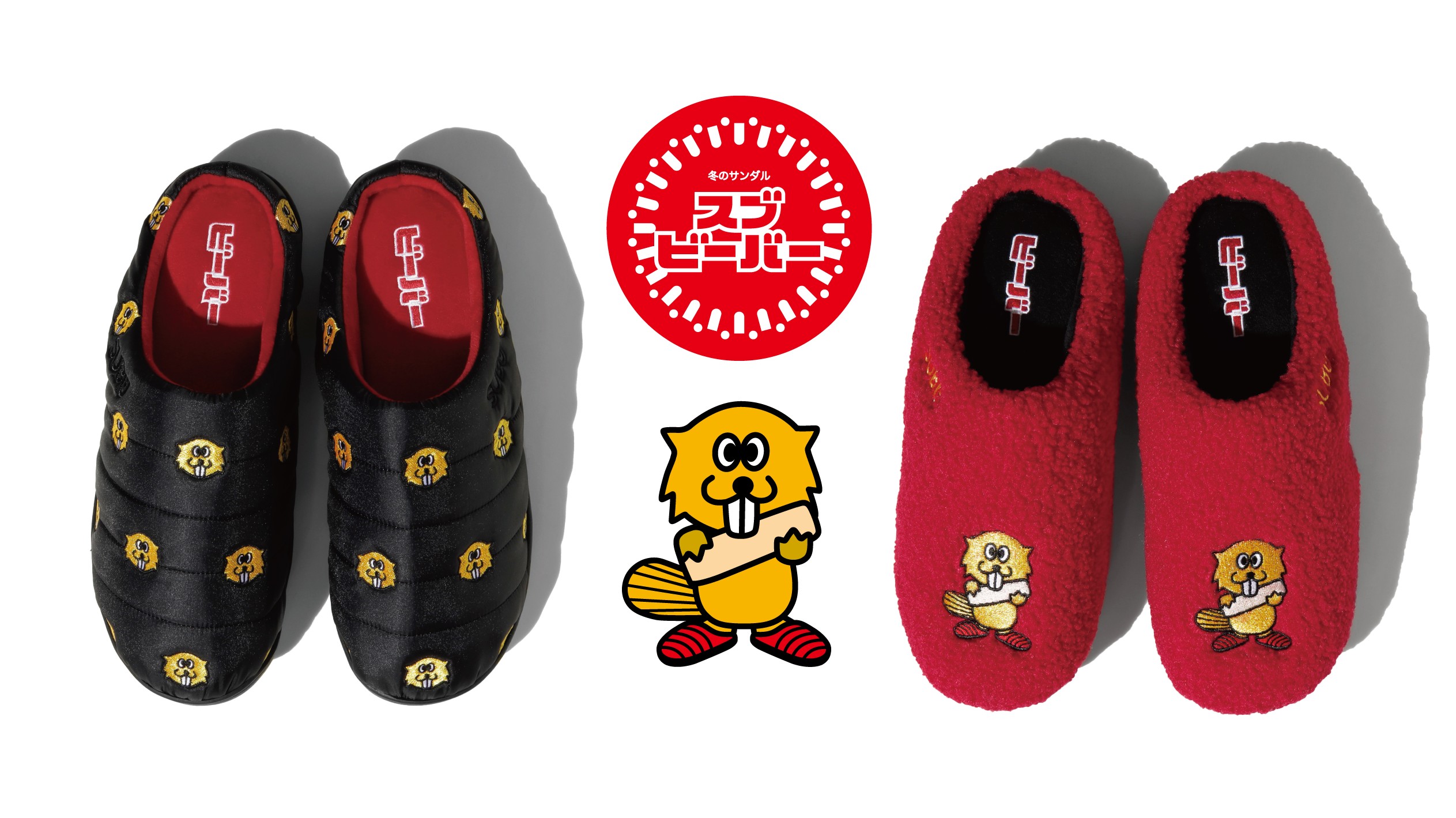 ㊧SUBU×ビーバー「FACE SANDALS」/ビーバーのフェイス刺繍をあしらった愛らしく存在感のあるデザイン。㊨SUBU×ビーバー「BOA SANDALS」/ビーバーを象徴する“赤”のボア素材を使用している