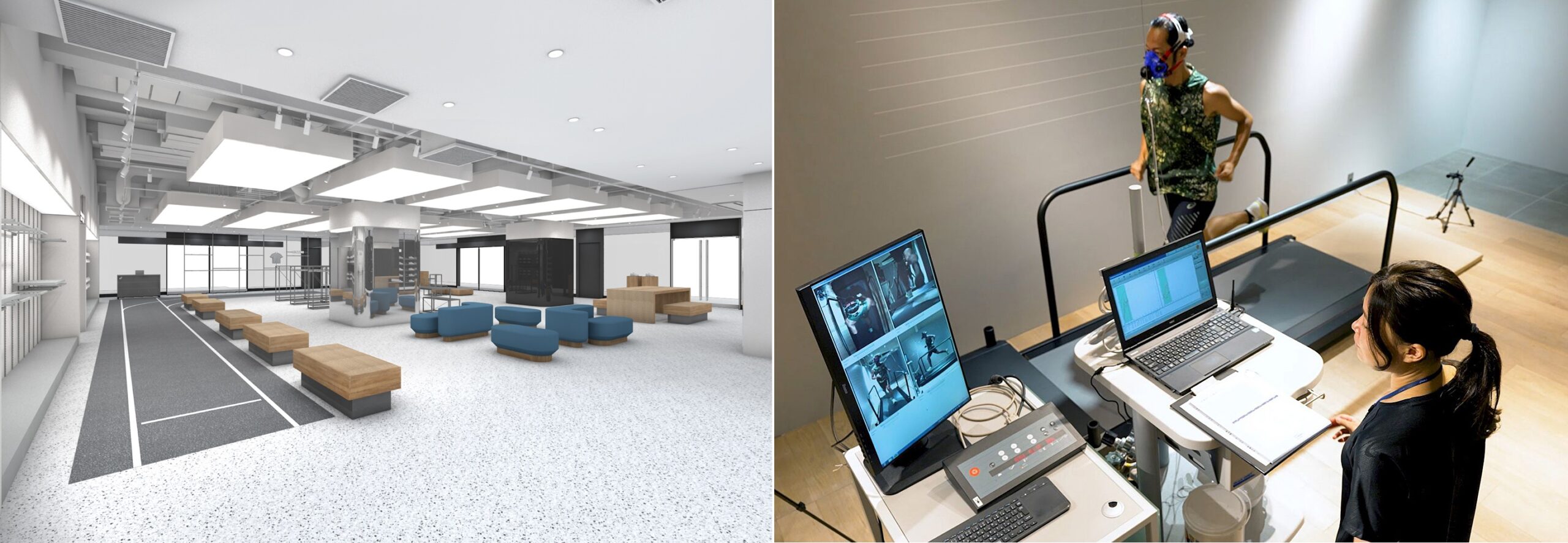 ㊧店内のイメージ画像、㊨「ASICS RUNNING LAB」の様子