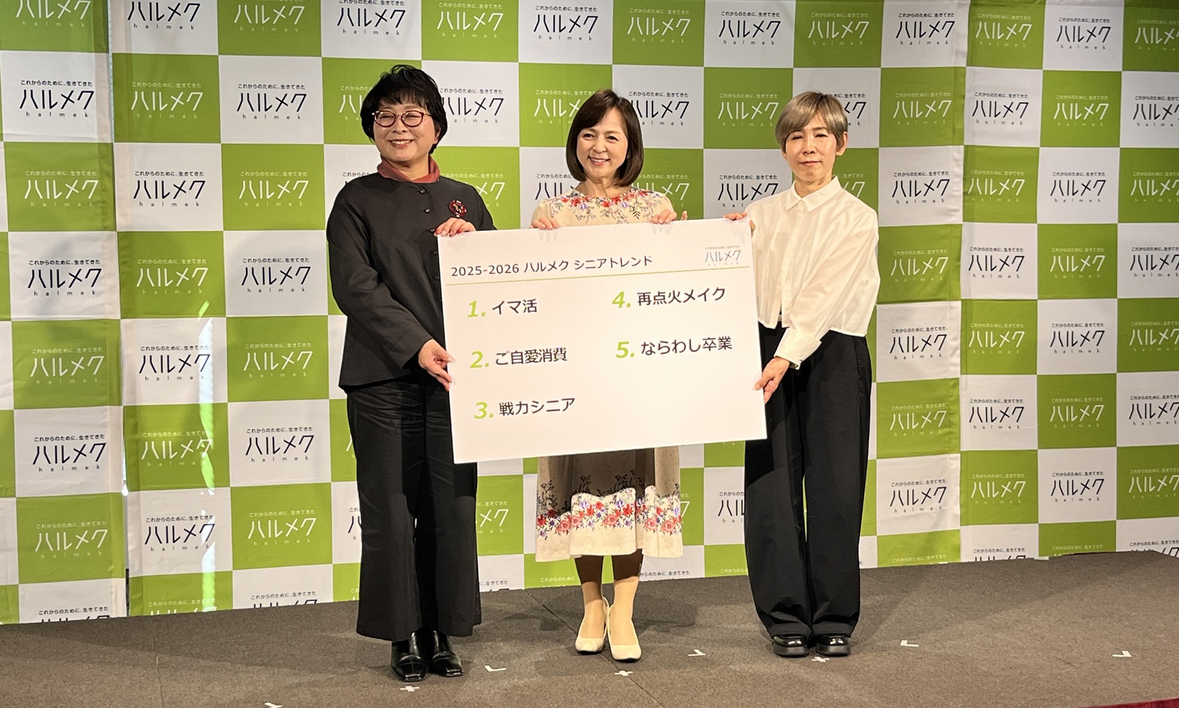 トークショーに登場した㊧からハルメクホールディングス生き方上手研究所の梅津順江所長、いとうまい子さん(俳優、研究者、経営者、大学教授)、岸順子(化け子)さん(ヘアメイクアップアーティスト、「ヘアメイク職人化け子」としてユーチューブを開設)