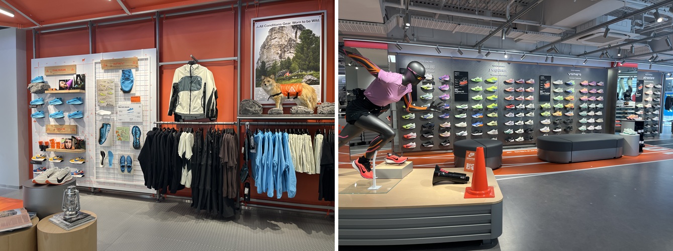 ㊧1階のACGコーナー、㊨2階のランニング/トレーニングフロアのシューズコーナー