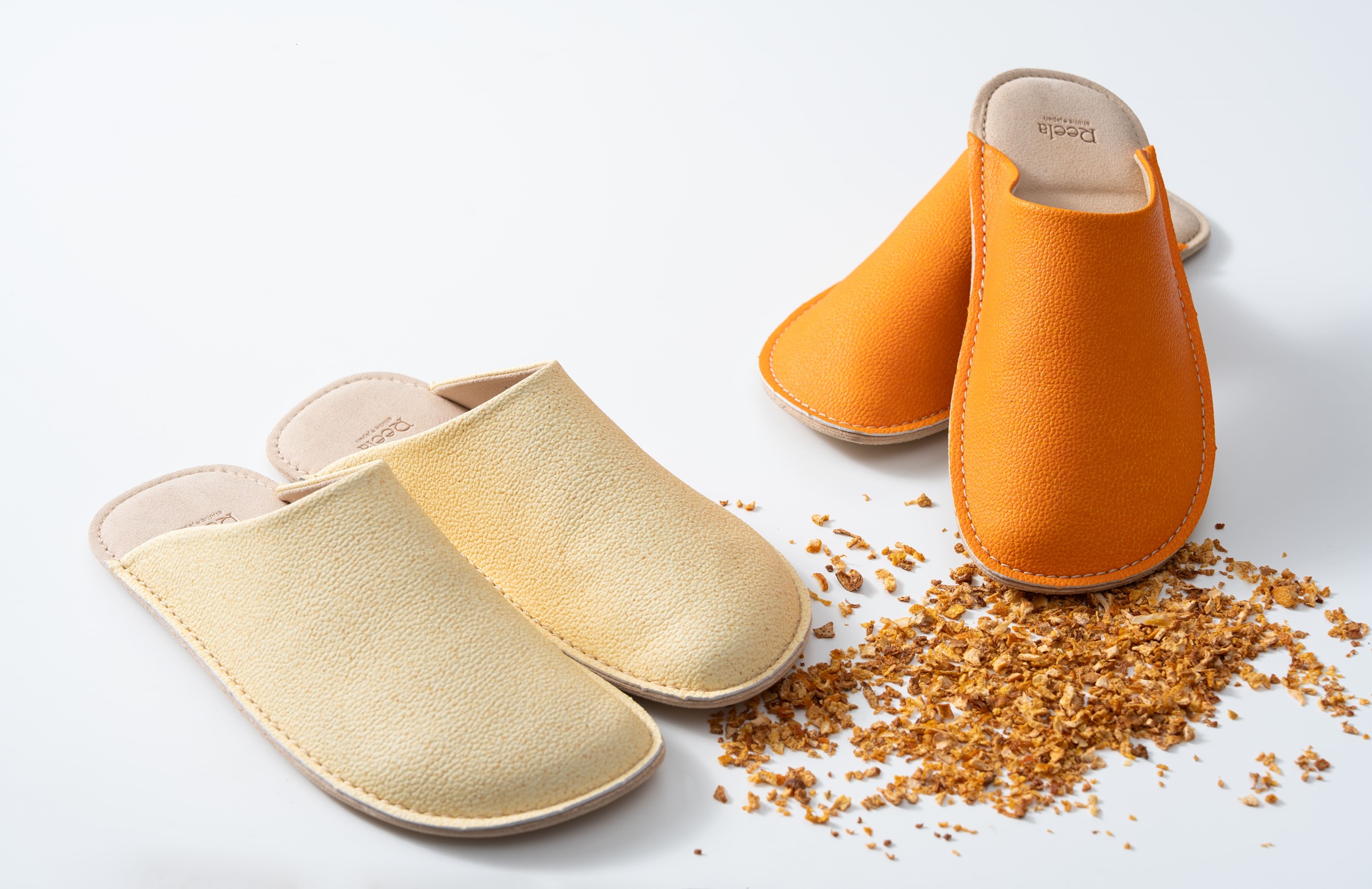モノツク工業、伊予柑の搾汁残渣を新素材「いよかん人工皮革」にアップサイクル――老舗サンダルメーカー・ヤマトと共同で商品化したルームサボを4月16日からMakuakeで注文受付