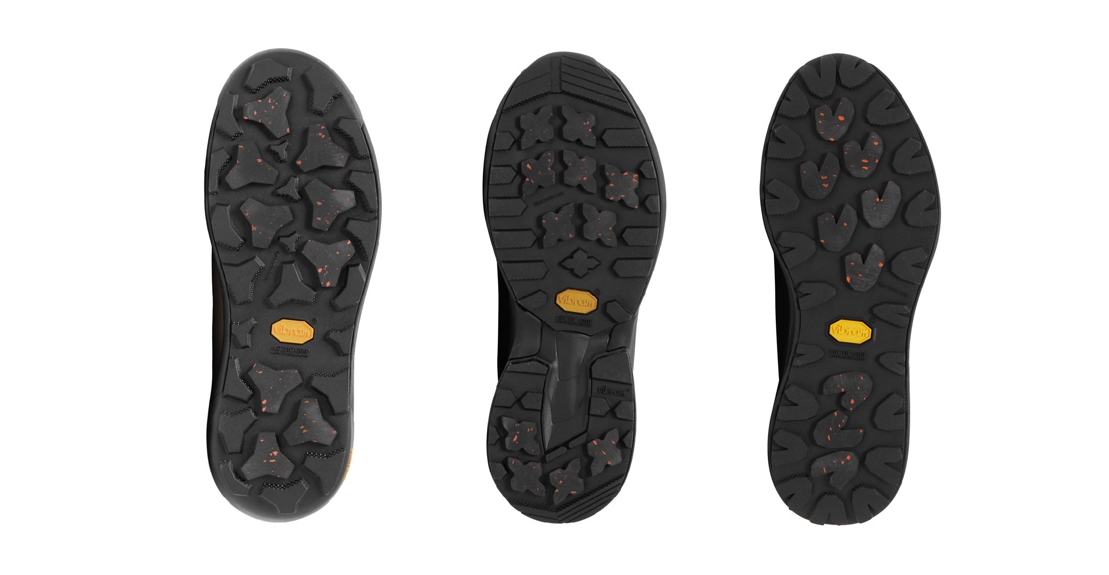 Vibram Arctic Grip ALL TERRAINソール。㊧全方位型、㊥踵集中型、㊨前後型