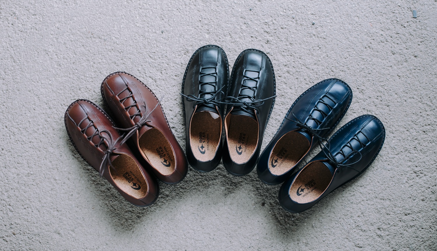 ブランドの核となるのは、佐賀の自社工場で培われてきた製法と技術。甲部分を縫い上げるステッチダウン製法は高い屈曲性を生みつつ、靴内にゆったりとした空間をつくる事で、履き始めから足になじむ。縫製がもたらす素朴な風合いもこのブランドらしさのひとつである。