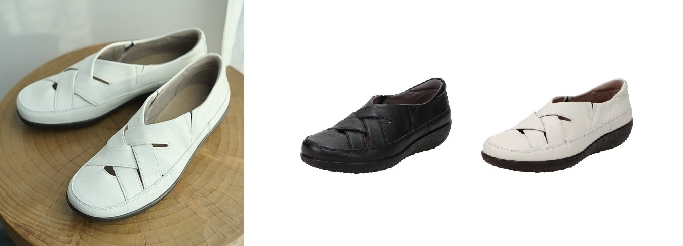 アキレス・ソルボ C 626 2万2000円(税込)/柔らかいスムース革を採用したクロスデザインのスリッポン。両サイドの隠しゴムで脱ぎ履きしやすい。カラーは黒、白の2色展開。サイズは22.0~25.0㎝(3E)