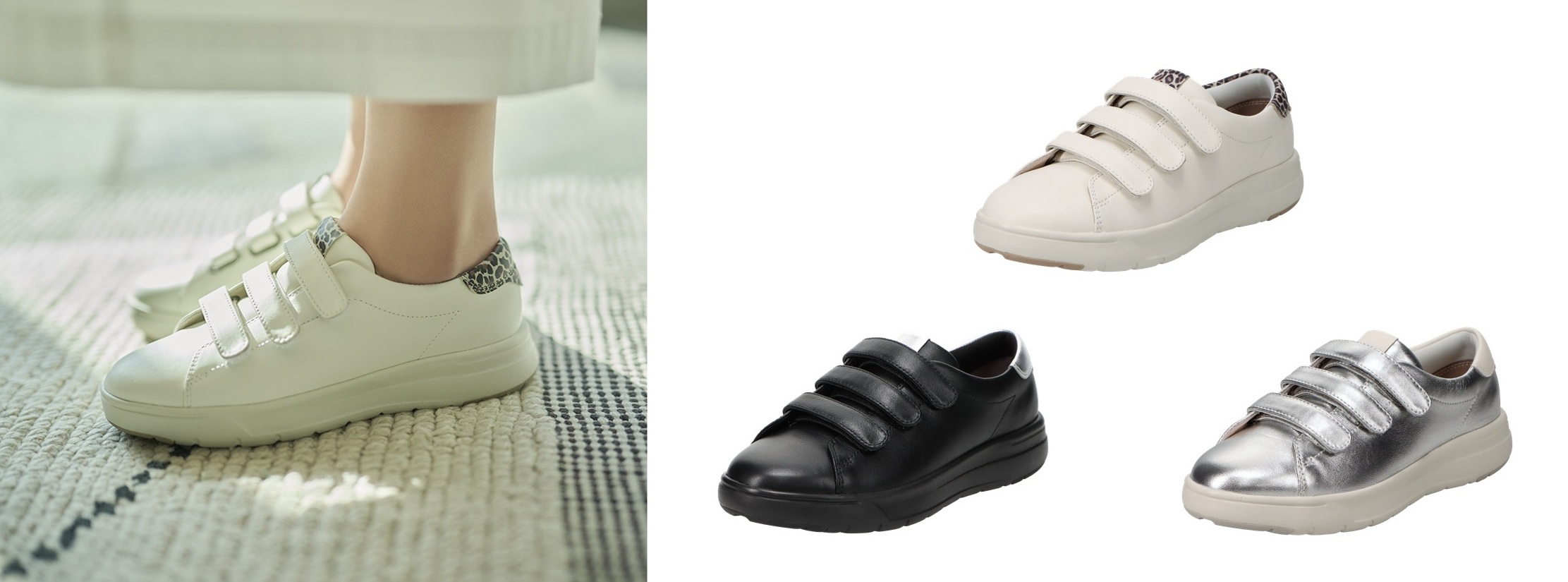 アキレス・ソルボ H 629 2万2000円(税込)/アキレス・ソルボ史上最軽量(※)のレザーコートスニーカー。3本面ファスナータイプには、ミニマルで合わせやすいスニーカーをデザインベースに、アクセントとしてシュータンと踵部分にレオパード柄や箔加工素材を取り入れた。カラーは黒、白、シルバーの3色展開。サイズは22.0~25.0㎝(3E) ※従来品とのソール重量比較