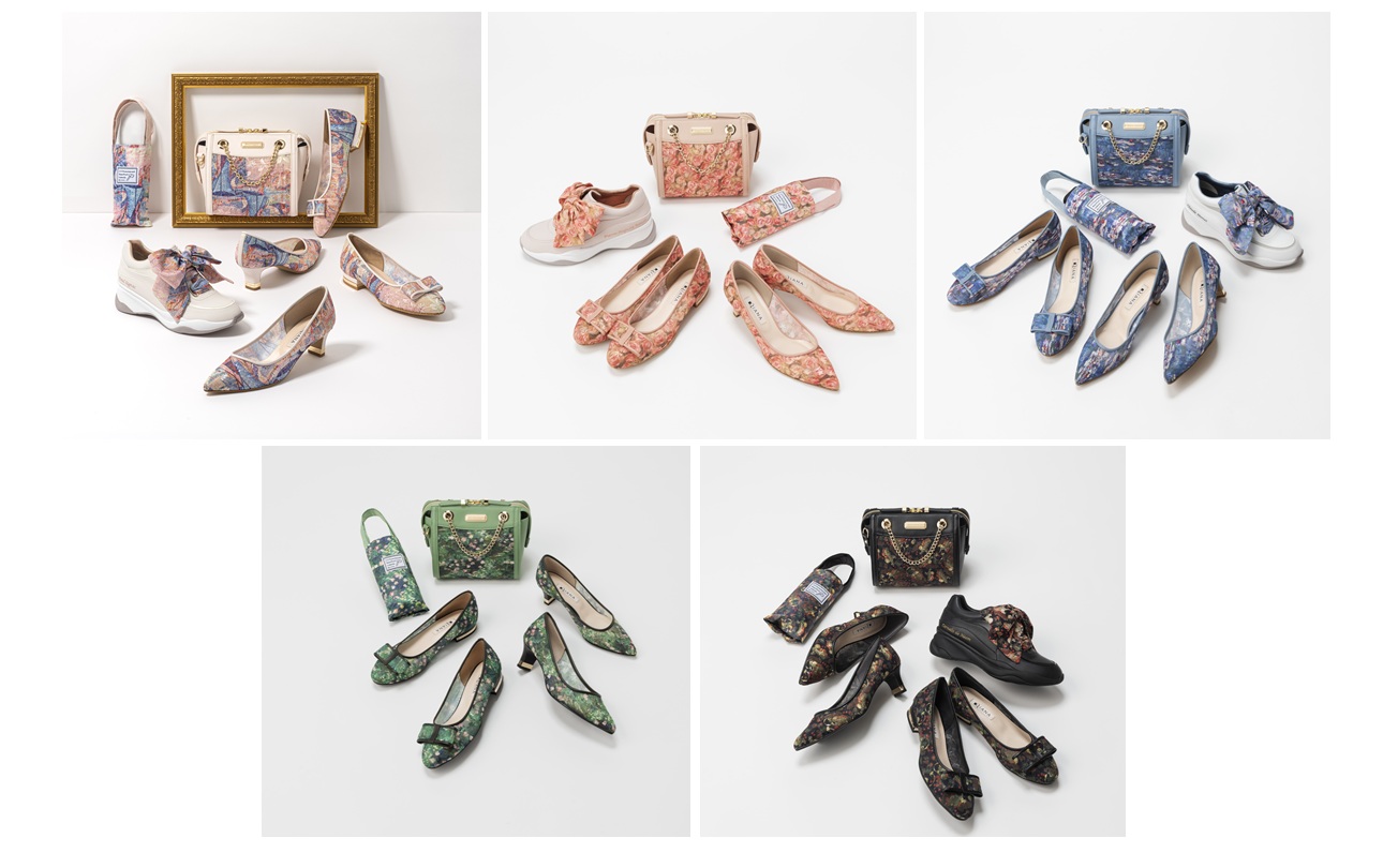 今回のコレクションは、国立西洋美術館が収蔵する絵画から、①ポール・シニャック《サン=トロぺの港》、②ピエール=オーギュスト・ルノワール《ばら》、③クロード・モネ《睡蓮》、④フィンセント・ファン・ゴッホ《ばら》、⑤コルネリス・デ・ヘーム《果物籠のある静物》――の5作品をピックアップして、パンプス、スニーカー、バッグなど、さまざまなアイテムで展開。気分の上がる華やかさ、シーズンを彩る特別感など想いを込めた心が踊るコレクションになっている。