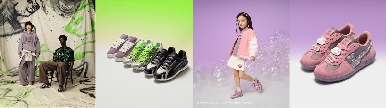 ㊧2点PUMA x RIPNDIP第2弾コレクション。シューズは左から「ユニセックス PUMA x RIPNDIP スウェードXL スニーカー」「ユニセックス PUMA x RIPNDIP インバース スニーカー」「ユニセックス PUMA x RIPNDIP インへイル スニーカー」、㊨2点PUMA x SANRIO CHARACTERSコレクション。シューズは「パレルモ HK&FR 2 PS」
