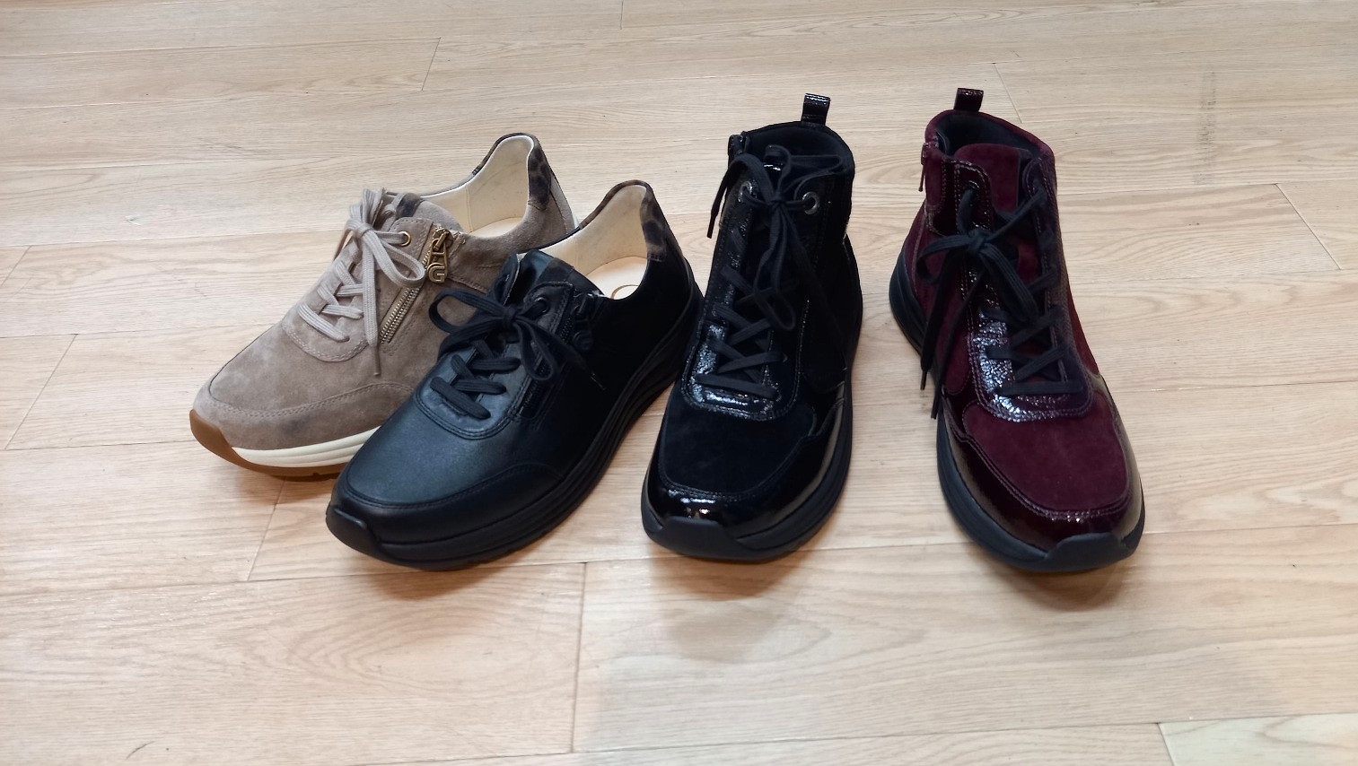 すべてGANTER AKTV(ガンター アクティブ)の新製品。㊧2点(カラー:トウプとブラック)4万8400円(税込)。㊨2点(カラー:ブラックとヴィノ)5万2800円(税込)。ウイズはすべてH(ワイド)