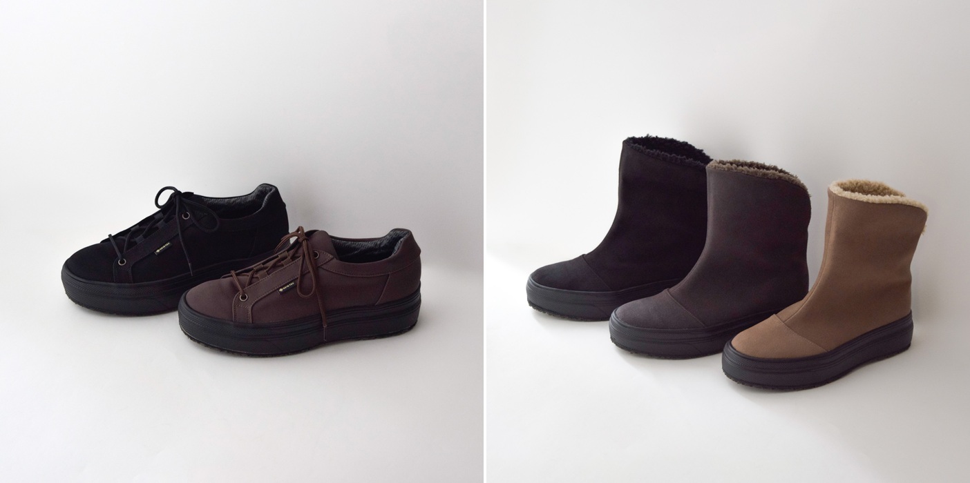 防水透湿性素材のGORE-TEXを採用し、雨の日でも安心して履ける厚底スニーカー「UE-254404」は、外羽根デザインでありながらベロ部分を袋状構造にすることで水の浸入を防ぐ仕様が嬉しいポイント。さらに、滑りにくいソールを使用しているため、雨天時はもちろん、寒冷地でも高いグリップ性を発揮。快適性とデザイン性を両立した、デイリーに活躍するアイテムだ。サイズは21.5~25.5㎝。価格は3万3000円(税込)。