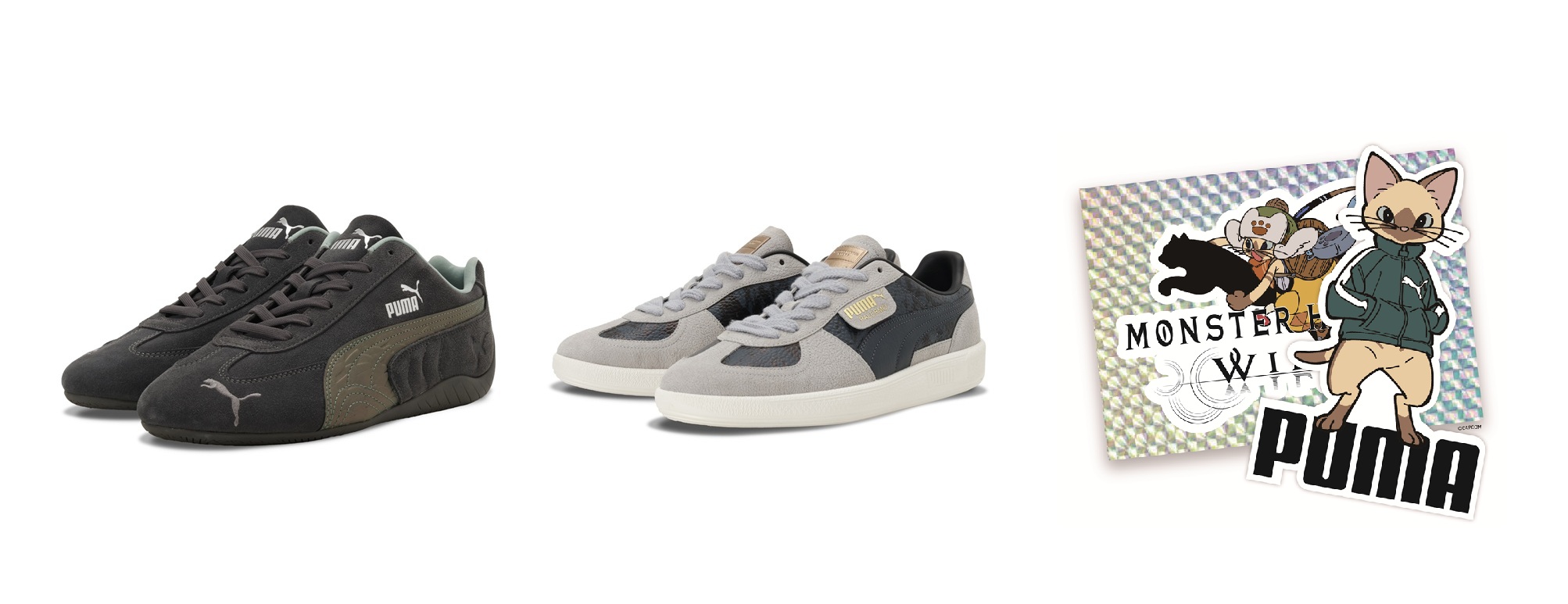 ㊧PUMA x MONSTER HUNTER WILDS SPEEDCAT、㊥PUMA x MONSTER HUNTER WILDS PALERMO、㊨キャンペーンでプレゼントするPUMA x MONSTER HUNTER WILDSオリジナルステッカー