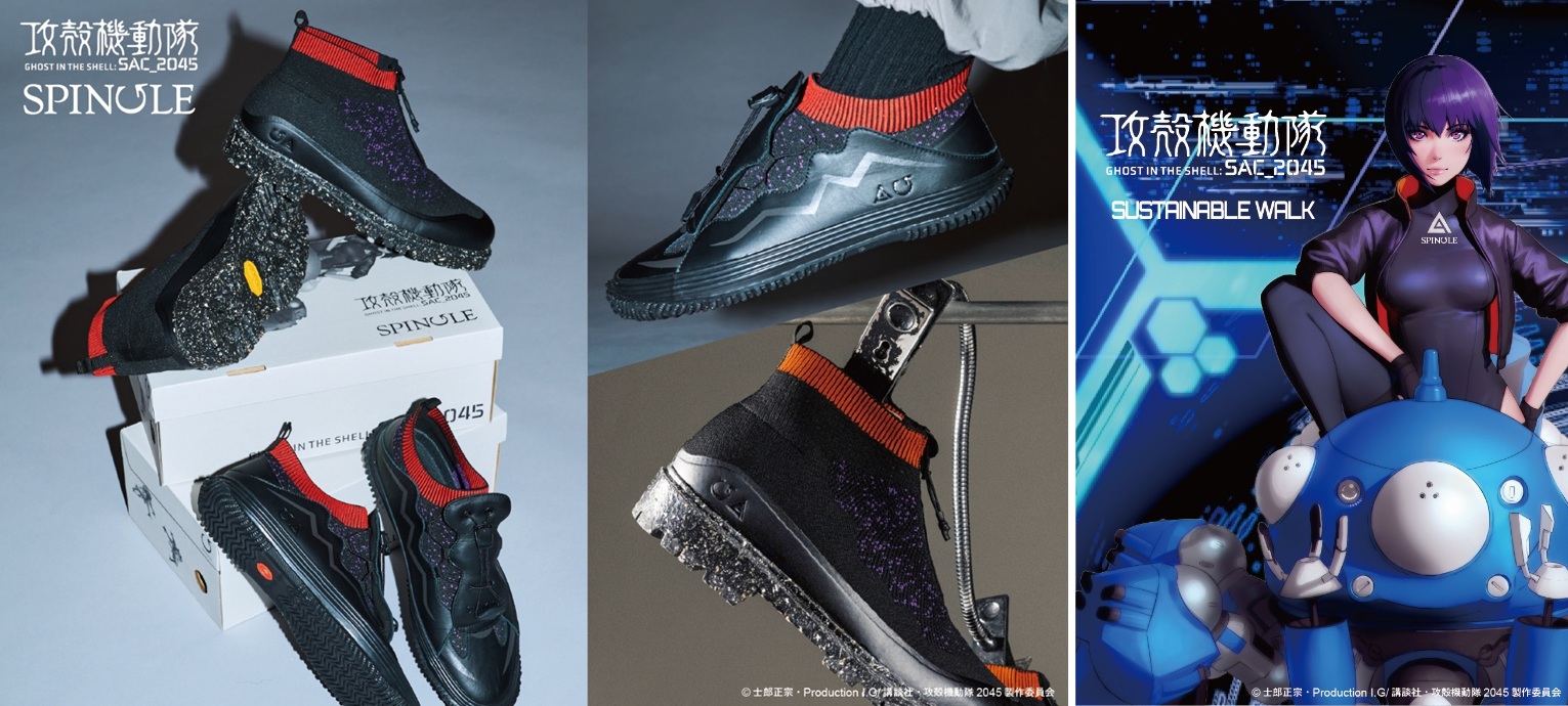 商品化にあたっては、作品の舞台である2045年や劇中のキーワード“サスティナブル・ウォー”からインスパイアを得て、テーマを「サスティナブル・ウォーク」に設定。2045年のスピングルのスニーカーを仮想し、サスティナブル素材を使用してデザインしている。ニットのメランジなどのカラーリング、コンバットブーツを彷彿とさせるフォルムは、主人公・草薙素子の劇中衣装をイメージした。