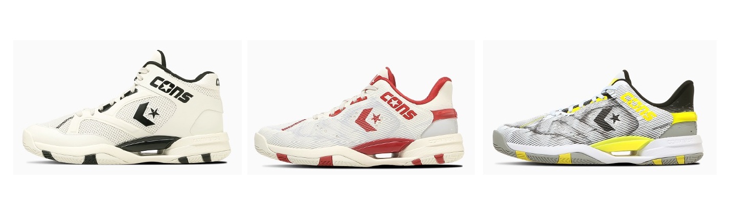 ㊧コンズ アクセレレーター MID(オフホワイト/ブラック)、㊥コンズ アクセレレーター LOW(オフホワイト/レッド)、㊨コンズ アクセレレーター NC LOW(ホワイト/ネオンイエロー/ブラック)