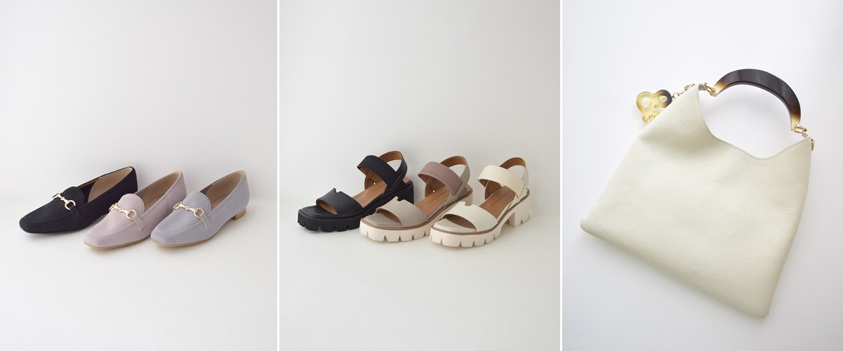 ㊧リサイクルポリエステル糸を用いたニットローファー「LS-FQ2622」、㊥レトロモダンなデザインのシンプルサンダル「IT-260295」、㊨ハンドルから本体、裏地に至るまで生分解性の高い素材を用いたハンドバッグ「AS-26009」