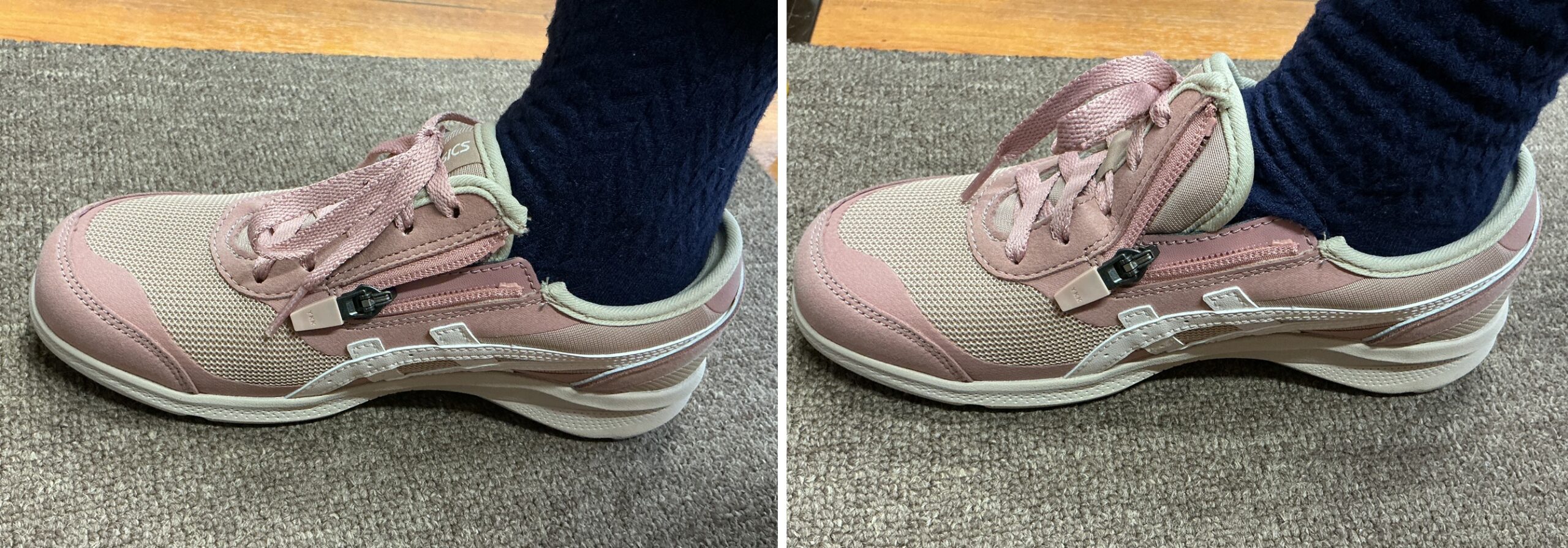 ㊧の画像は、まめに靴紐を締め直した場合(ファスナーはスッと閉まる)、㊨の画像は、靴紐はそのままで数回履いた場合(ファスナーは閉まらない)