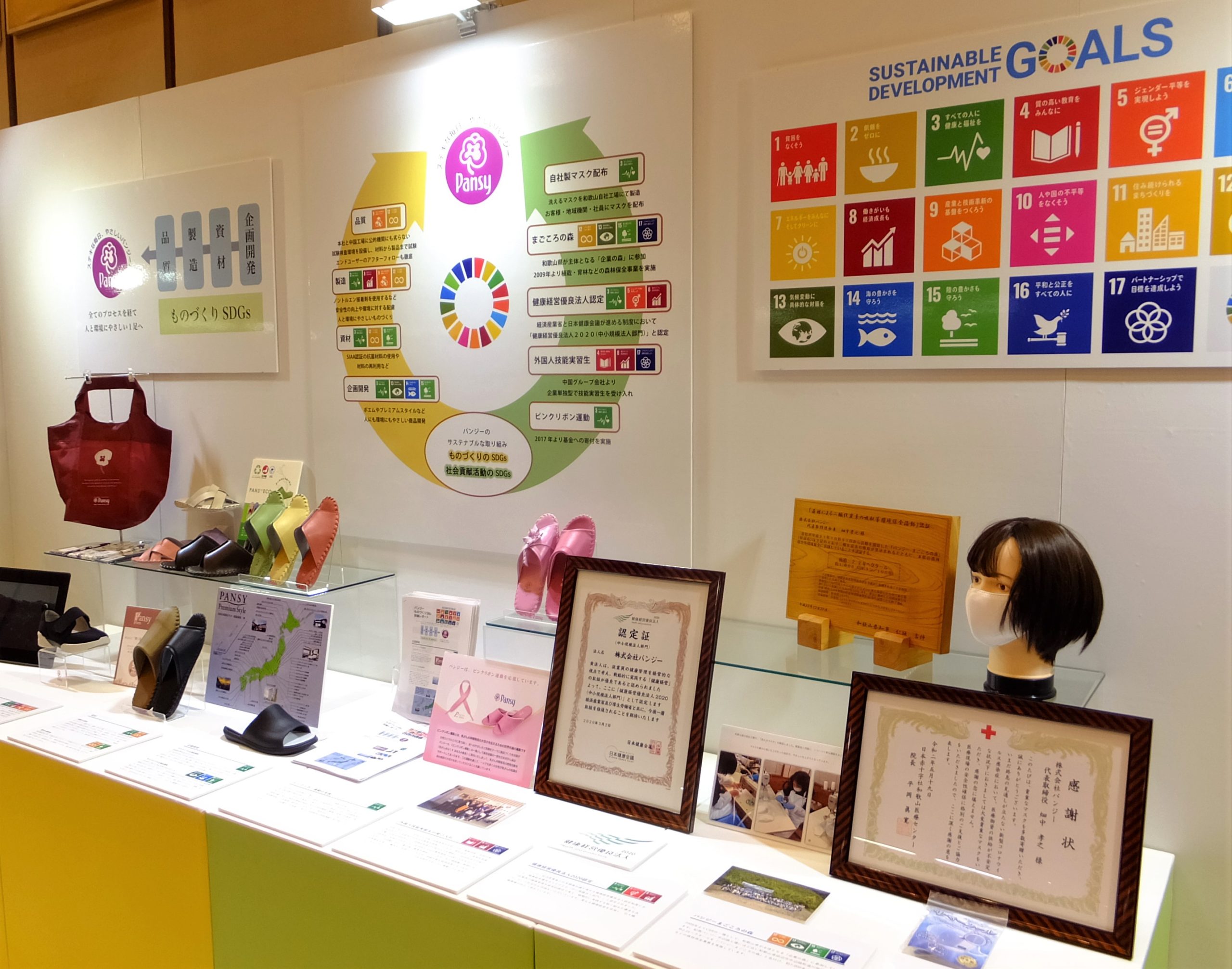 パンジーは、10月に神戸で開催した21年春夏向け展示会場に、同社が行っている「SDGsへの取り組み」を表現したパネル&商品を展示し、来場者にアピールを行うとともに、認知度のアップに努めた。今回、同社は「社会貢献」と「ものづくり」という2つの観点からSDGsへの取り組みをまとめた。